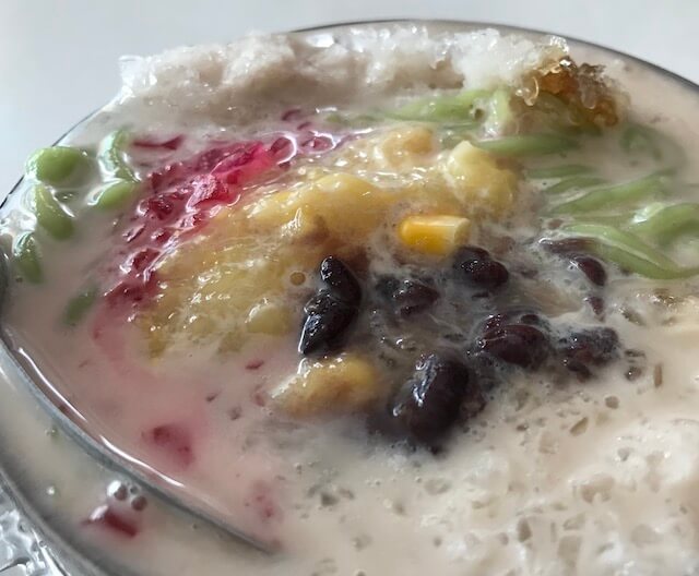 氷、小豆、チェドル(緑色をした寒天の一種)、チンチャオ(黒い寒天の一種)、コーンなどが入り、そこにローズシラップと呼ばれる赤いシロップと、ココナッツシュガーで作られたココナッツシロップがかかります。