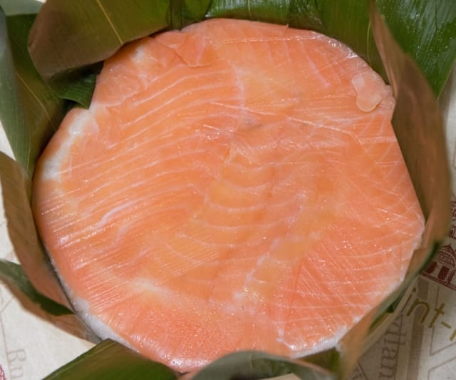 酒を片手にパッケージを開く。容器は木製の「曲げ物」。中身は笹の葉に包まれたますの押し寿司。笹の葉の香りとしっとりとしたますの身を肴に酒が進む・・・。土産は「駅弁(ますのすし)」にしよう。「おーい!お土産買ってきたよ!」