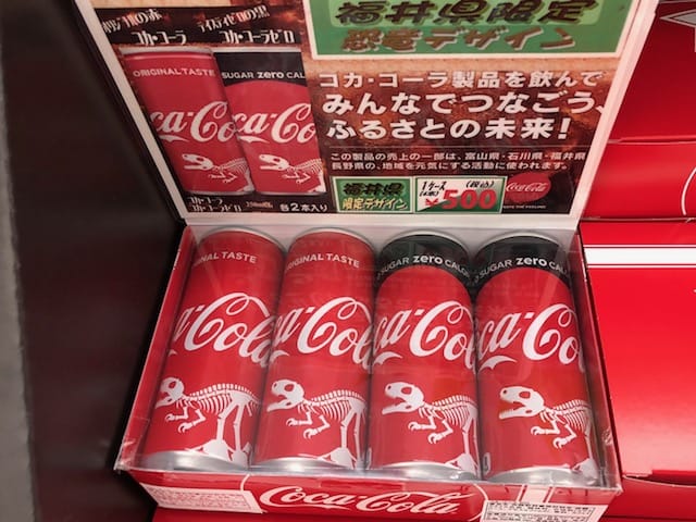 その中でも、福井県限定デザインのコカ・コーラが、「恐竜王国ふくい」ということで、恐竜の骨格標本のデザインです。きっとお土産に喜ばれますよ!