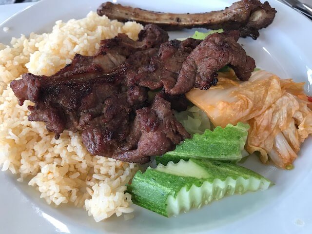 ご飯に肉がどんと乗っかり、隅っこの方に野菜がちょこっとついている…というとても豪快な料理です。