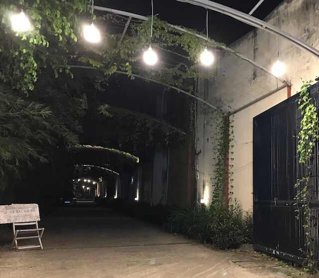緑のトンネルを抜けると、オープンテラス形式のレストランがでてきます。オレンジ色の電球でライトアップされていてとてもおしゃれ。