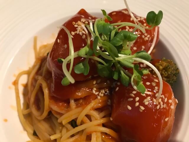 今回頼んだのはパスタとサラダですが、サラダの盛り付けがびっくりするほどおしゃれ!