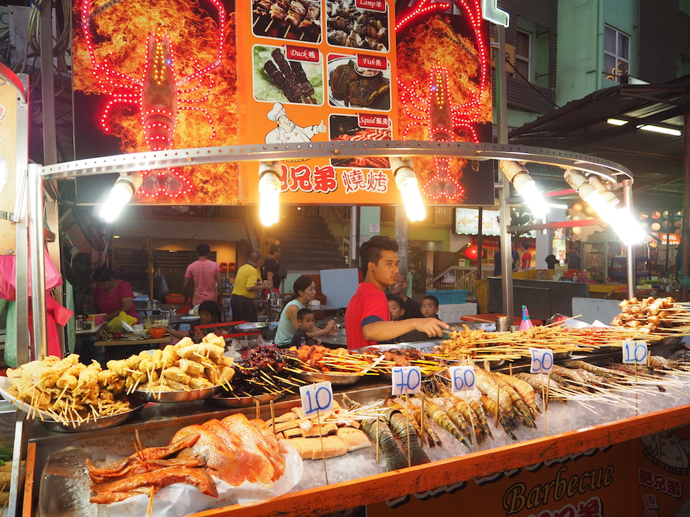 マレーシア名物のサテーをまだ食べていなかった私たちは、黄色い看板の小さな屋台、ライトに照らされ輝きを増すいくつもの山積みにされた串焼きに目を奪われ、人と屋台に揉まれる中、ビールとサテーで落ち着けることにしました。