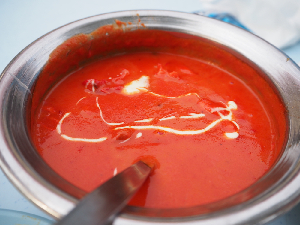 チキンバターカレーは赤い見た目とは裏腹に辛さはなく、スパイスのパンチもなくどちらかというと甘めな印象。