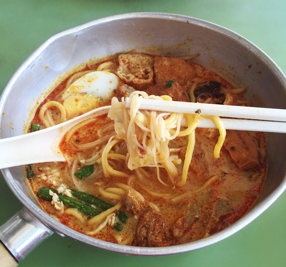 ラクサ | ココナッツミルク風味の効いた通常のラクサとは異なり、レモングラスや、カリーリーフといったさまざまなハーブを使ったカレー風味がベース。具材は海老と赤貝が基本、麺は通常イエローミー(タマゴ麺)ですが、ビーフンで注文もできる。 | |