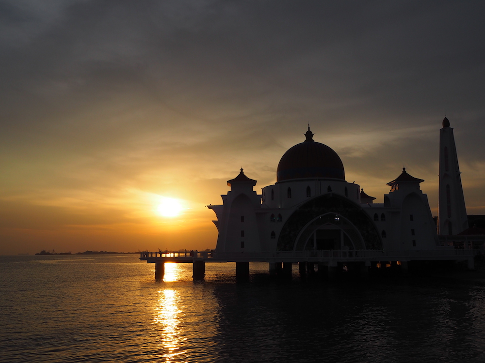 ここマラッカにも夕陽が見れる絶景スポットがあります。それはモスク越しにマラッカ海峡に沈む夕陽です。