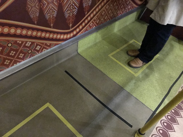 移動中のバスの中でさえ、間隔を開けるサインがありました。