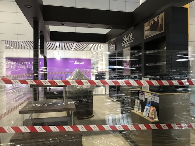 いつもはいろいろな商品が所狭しと並び、賑わっている免税店の棚にビニールテープまで貼られていたのにはびっくりしました。