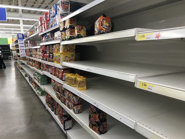 スーパーではインスタントラーメンや、乾麺、お米、ビスケット類、缶詰など長期保存の効くものを買い占める人が多く、一時期それらの商品の棚が空っぽになることも…。