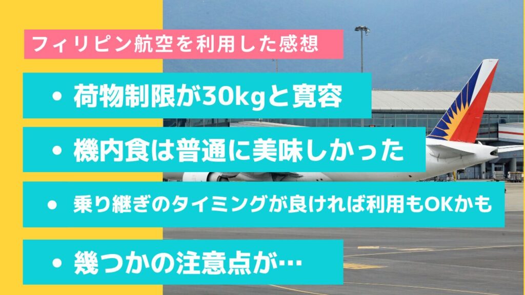 フィリピン航空を利用した感想を下記の4つの観点から簡単に解説します。