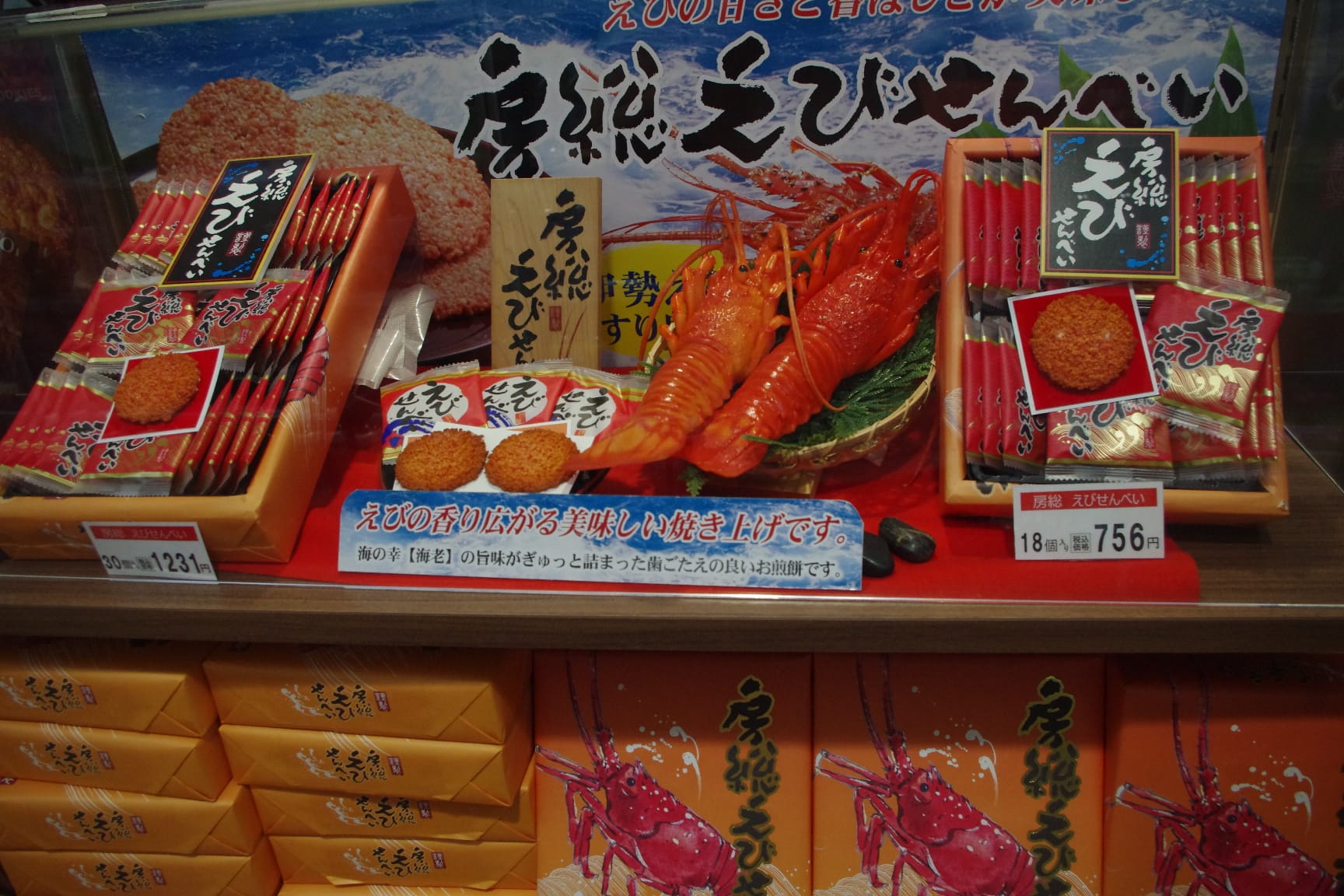 この房総えびせんべいについては、他のターミナル・店舗で販売されているのを目にしなかったと思いますが、類似の魚介系のせんべいのお土産品は、第1・3ターミナルなどにもある「東京食賓館」などで目にしました。