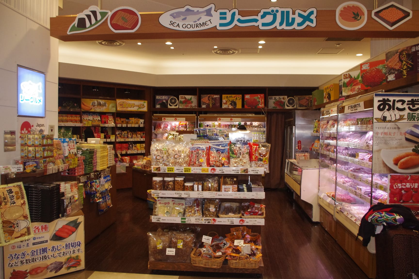 店頭に魚の絵が描かれ、たくさんの魚介グルメで埋め尽くされた「シーグルメ」のお店では、たくさんの魚介系グルメのお土産や、おにぎりなどの簡単な食材を買うことができます。