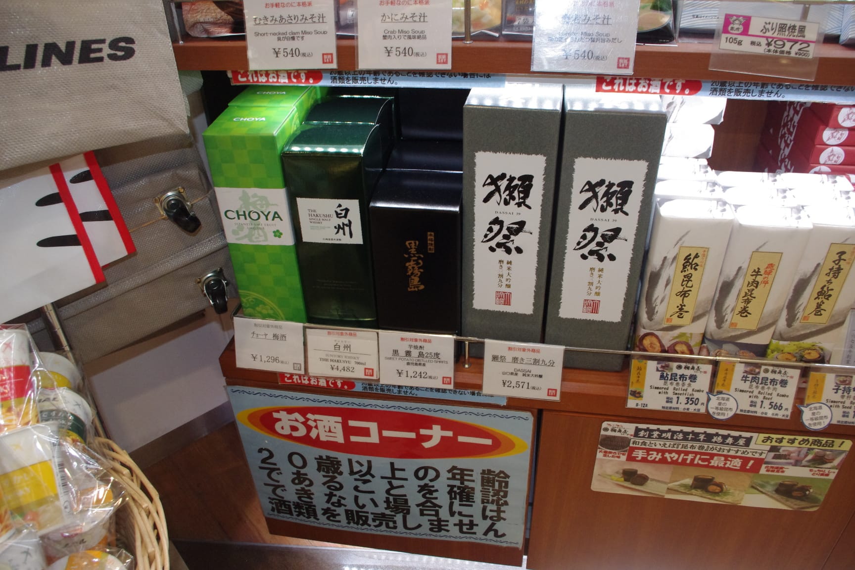 成田空港では、出国・搭乗前のお土産エリアの「BLUE SKY(ブルースカイ)」などのお店で、日本酒・焼酎・梅酒・ウィスキーなど、各種お酒商品をお土産に買うことができます。