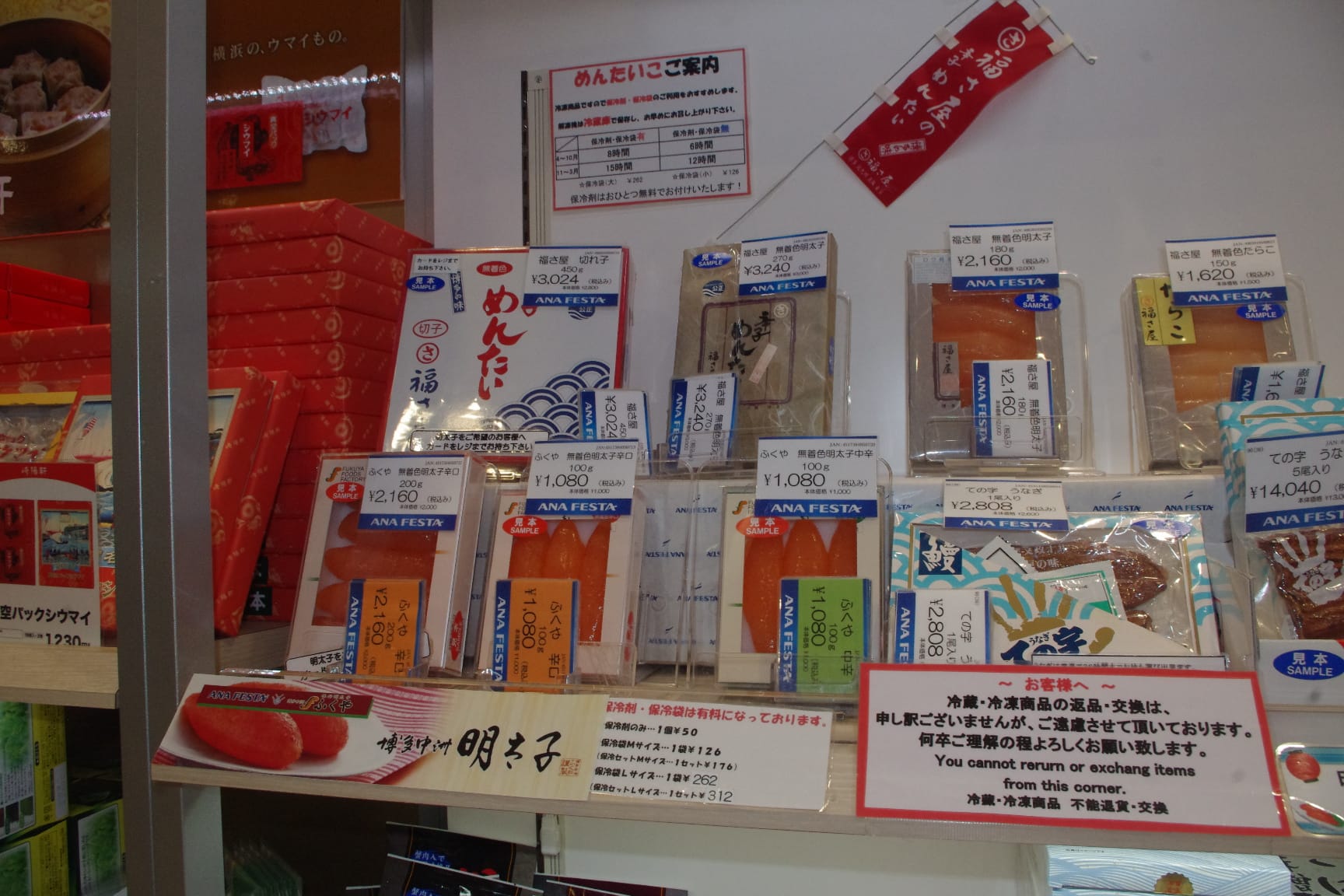 また、ふくや以外の明太子商品について、第1ターミナルの「御当地商店 四七堂」などでも販売されているようです。 第3ターミナルの店舗については確認できていませんが、もしかすると多くの食材を取り揃える「東京食賓館」などのお店に明太子もしくは類似食品のお土産があるかもしれません。(現地もしくは事前にインターネットなどで要確認。)