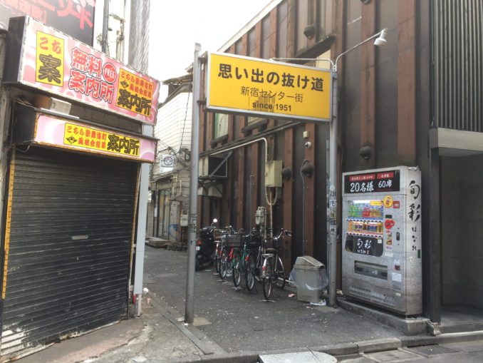 歌舞伎町の飲み屋やちょっと怪しいお店が立ち並ぶ通りには、ふと黄色い看板が掲げられた、「思い出の抜け道」という小さな飲み屋通りがあります。