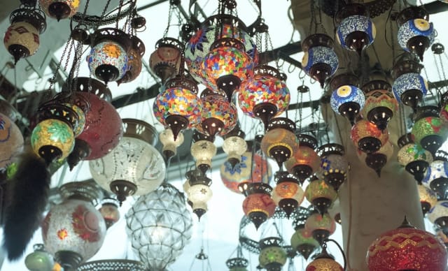 グランド・バザールでは天井から吊るされたものから卓上のものまで、様々な色合いと大きさのトルコランプが売られています。