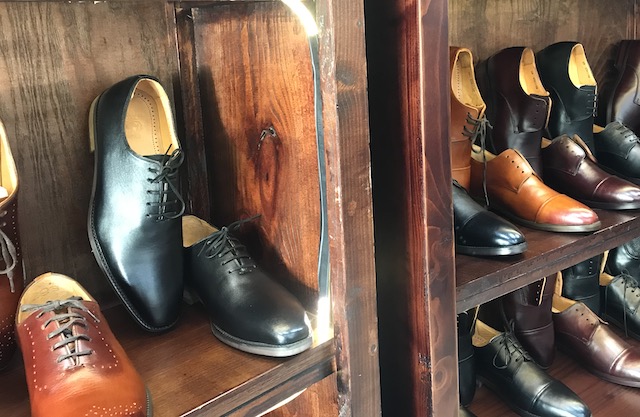 まず革靴のいい匂いがお店に漂っていました。いろいろなデザインや色の靴が棚に並んでいました。
