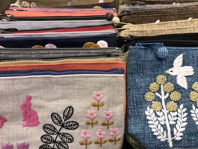ポーチなどの小物に刺繍が施されていてとてもお洒落です。これ、一つ一つ手作りで作られているのだそう。