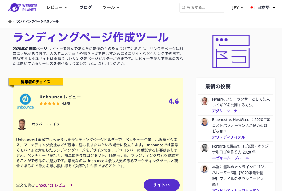 企業やアフィリエイト個人事業における、商品・サービス・キャンペーンなどを訴求し、売上に繋げるために作成されるランディングページについて、主に海外の人気サービスが検証レビュー・格付け紹介されています。