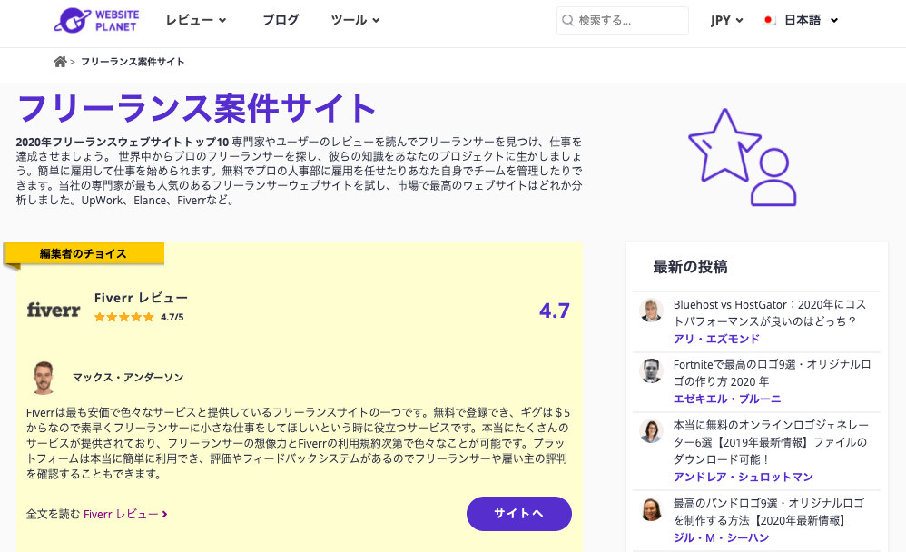 Website Planetでは、「Fiverr」や「UpWork」など主に海外で知名度が高いフリーランス案件サイトが検証レビューされています。