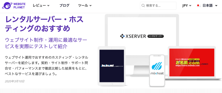 Website Planetの日本語ページでは、日本の知名度・ユーザ数が多く、おすすめできるレンタルサーバーや、海外の一部レンタルサーバーについても比較レビューされています。